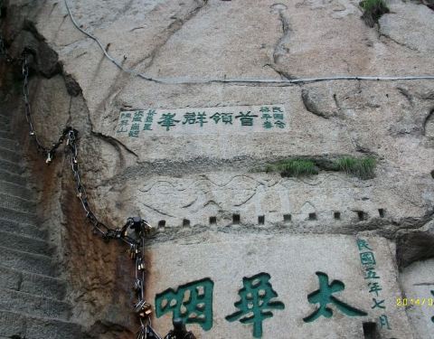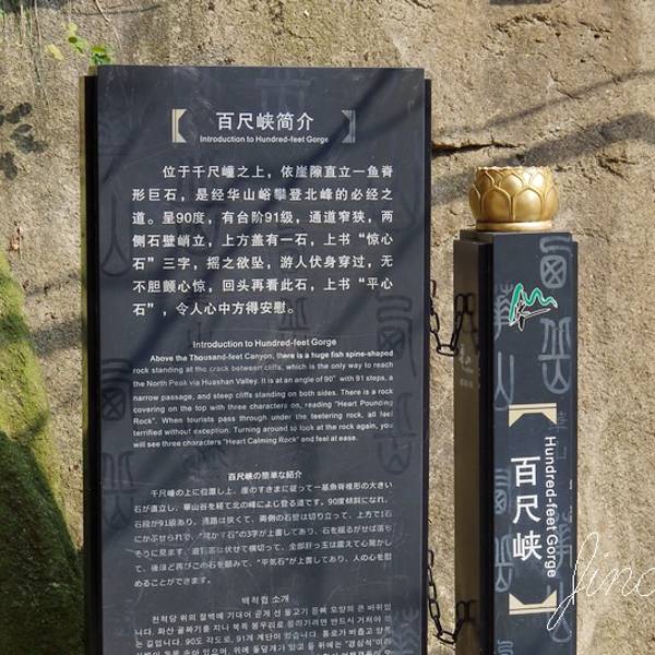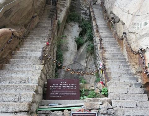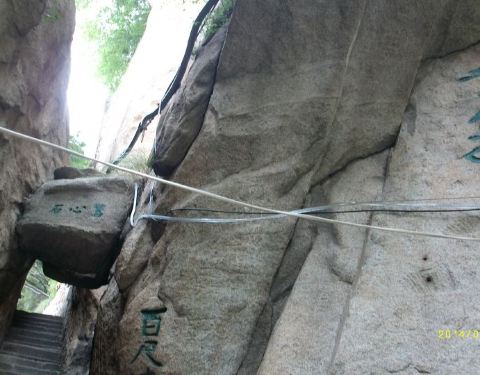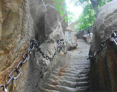 华山景点,不单独收费,爬过千尺幢就是。倾角甚至超过了千尺幢,宽度也稍微少点,但它分左右两条线,右侧稍微旧点。百尺峡尽头是一块架在头上的巨石,号称惊心石,不过说实话,爬到这里,已经觉得如果落下来也许...