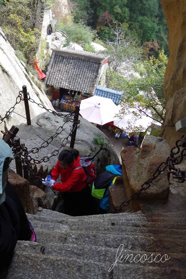 百尺峡的台阶非常的狭窄,有的地方甚至快90度了。最好是扶着两边的锁链往前走