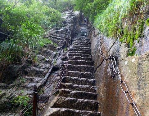 也叫“百丈崖”,这里山体峭陡壁立、四方如削,有石阶,须挽铁索而上。