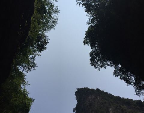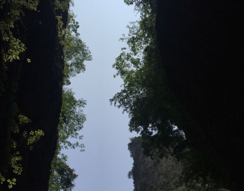 月牙峡位于金丝峡中部,距峡门3800米,为黑龙峡的最窄处,一面是旗杆峰,一面是猫耳崖,两山错落叠置成壁立峡谷。从谷底仰视,光线从崖缝照进来像弯弯的月牙,故名月牙峡,也叫“天坑地缝”、“天隙一线”。