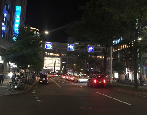 夜幕降临过后的大丸百货,就是札幌站前大街上最靓丽的那栋楼。札幌城市并不大,沿着札幌站前大街走下去,就可以一直来到大通公园,旁边还会途经旧厅。其实说起来,站前大街上的行人还不如地下购物街的行人多,因为走在下面可以避免风吹日晒,冬天的时候还不会被大雪滑倒。所以在地面上看站前大街,显得札幌格外的清清爽爽干干净净。