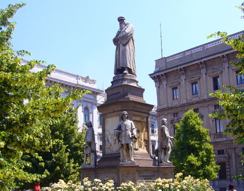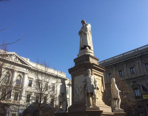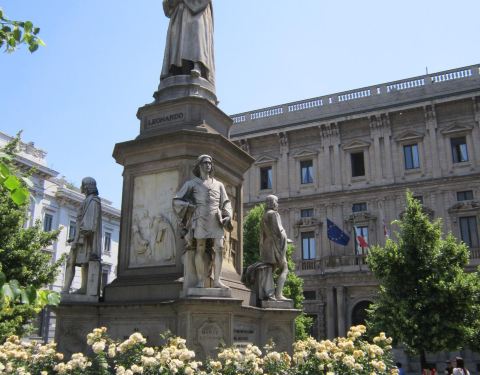 斯卡拉广场的中心是达芬奇纪念碑,雕塑家彼得罗·马尼的作品(1872)。斯卡拉歌剧院对面,一座文艺复兴时代的艺术家达芬奇的雕像矗立在高高的台柱上,头戴帽子,身着长袍的达芬奇抄手而立,低垂着头,一副专心思索的样子,碑座上还有他的四位得意门生的雕像。雕像很精致,表达着人们对这位大师的敬仰。达芬奇曾于1482至1499年期间在米兰生活,他生活过的痕迹至今还清晰可见。