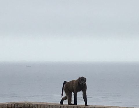 来南非确实感觉人和自然和谐共处了,到哪里都有野生动物相伴,这个叫开普角,是脚踏两洋的灯塔,大西洋和印度洋。 这边大西洋海水比较冷,印度洋海水比较热,所以两股交汇形成很大的风,但是两洋交界肉眼是看不出来的,只能从海水成分分析,大西洋海水矿物质相对比较丰富。 这边避免不了风大,多数人都是坐登山小火车上去,步行下来,步行下来十几二十分钟就可以了。但要小心这里的狒狒,他们抢东西吃和抓人抢包时有发生。吃的喝的不要出现在它们面前就好。