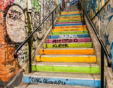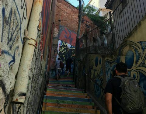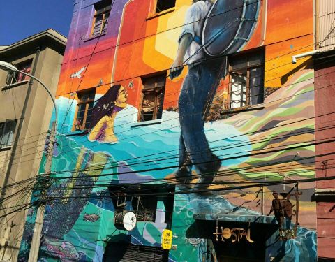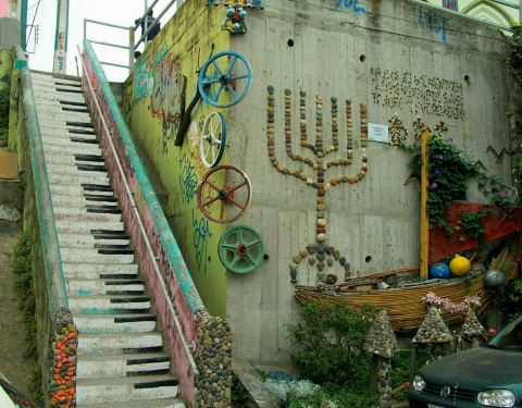 这是瓦尔帕莱索街头非常有特点的涂鸦艺术,在建筑物的墙面用绚烂的颜色绘画出各种各样的图案。有的是人物,有的是风景,有的是抽象画,各式各样,非常的有艺术水准,真的是高手在民间。