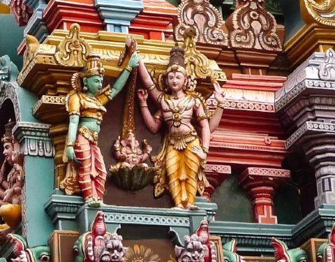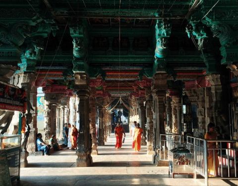 马杜赖不是一座精美的城市,却有一座绝伦的神庙,你可以不喜欢它,但是不能不仰视它。马杜赖是印度教的圣地,以宏伟的寺庙建筑、精美的雕刻艺术而著称于世,并享有东方雅典的美称。 米娜克希神庙供奉着米娜克希女神和她丈夫湿婆神,以及他们的两个孩子。东西南北各有一座高耸的印度塔门,站在城市的任何角落都可以看得到,简直可以说是城市的象征。主塔身上鲜艳色彩的仙女、神物和怪兽尤其让人印象深刻。庙群的中央建有一巨型金莲池,供信徒沐浴洁身之用。庙内另有博物馆,展示印度教的神像、雕刻品和图片。印度教徒认为,到米娜克希神庙顶礼膜拜就如同到恒河中沐浴一样神圣。