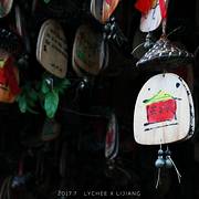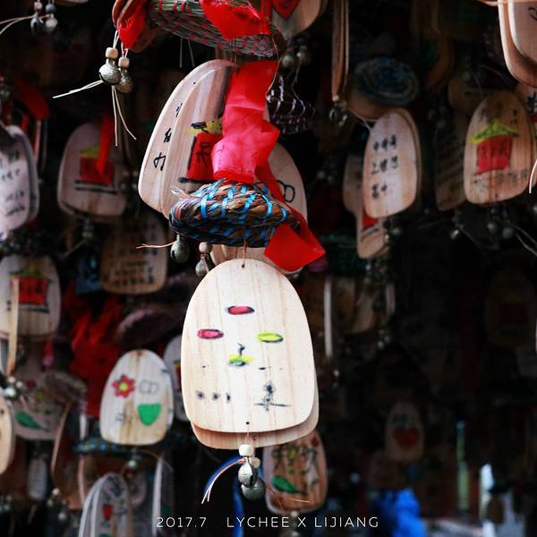丽江古城大水车广场旁有一个许愿风铃群,大广场旁边很显眼。人很多是古城里游客必去的地方。两张木片加一个风铃,风中摇曳生姿。以前的马帮马匹和骆驼上都挂着风铃,听到风铃声就是马队平安回来了,是吉祥的标志。现在这些许愿牌给喧闹的古城平添一抹亮丽的色彩和祥和的氛围,因为它象征着浪漫与美好。