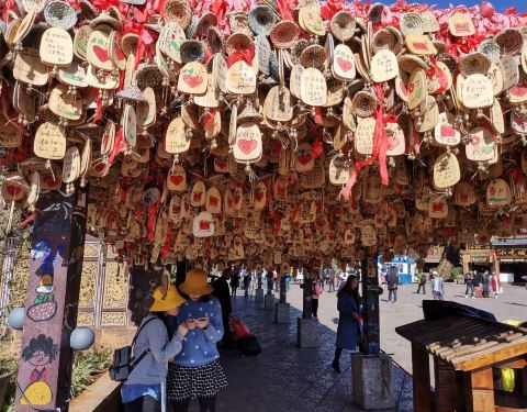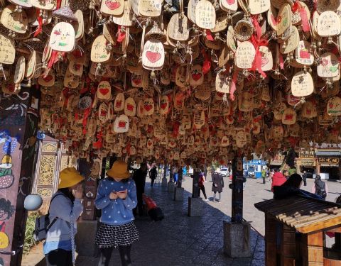 丽江许愿亭位于古城入口处,靠近玉河广场,旁边就是丽江大水车。走进古城,第一眼就能看到这挂满风铃的长廊,木架上密密麻麻挂着写满美好愿望的许愿风铃,组成这道独特的风景线。在纳西族心中,这种风铃能带来幸运,只要相信,叫天天答应,叫地地答应,叫云云会来,所有的愿望都能够实现。你不妨也在此挂上一只风铃,系上心中的期待,闭上眼睛,给自己许个愿吧。