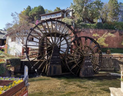 从丽江古城的入口进入,靠近“玉河广场”,就是“许愿亭”,旁边就是丽江“大水车”。一条挂满风铃的长廊,挂着许多写满各种祝愿、祝福的许愿风铃,随风飘动,形成一道独特的风景。