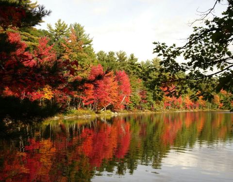 这是多伦多郊外一处深秋欣赏红叶的好地方,平静的湖面倒映出,红黄绿三色的枫树林,那样的美景让人无法想象。这里原始森林茂密,空气极为新鲜,泛舟湖上犹如在油画中漫游,那感觉真是太美妙了。