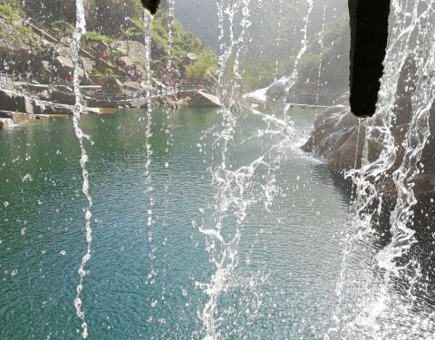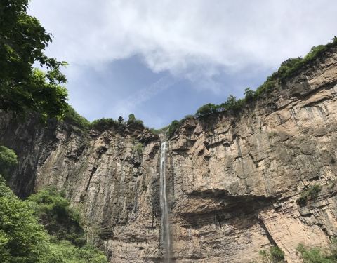 细细的一道水流从天而降。这个就是八里沟瀑布。瀑布顶有个八里沟村。可以从电梯上到村里。另外也有登山路可以爬山到村里。我们最后选择了自己爬上山。并不可怕。还是很有意思的。瀑布下面有个水帘洞,可以去走一圈。