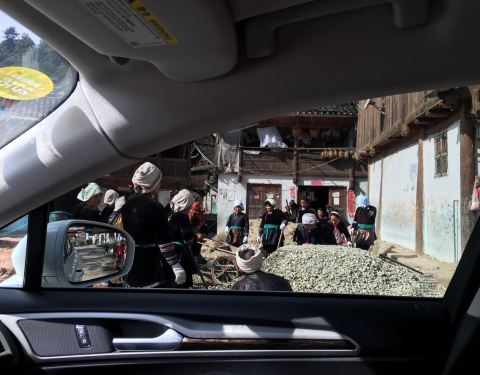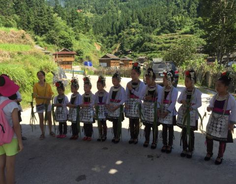 在去小黄侗寨途中,经过岜扒侗寨,突然发现寨门旁的亭子里,一群身着侗族服装的小女孩在唱歌,美妙绝伦的歌声使我们决定停车探个究竟。原来她们唱的是拦路歌,在等深圳来的小伙伴。在寨子大门口唱拦路歌、献酒是对远道而来的客人表示欢迎的仪式。十几个小女孩,唱出几个声部,其音色、音准、节奏把握得那么好,可见这个民族是个天生就会唱歌的民族。