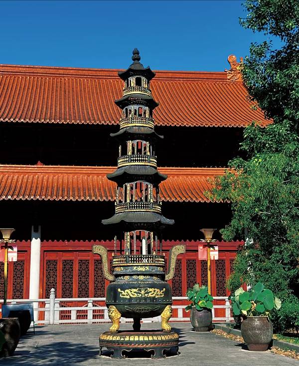 报恩寺为溧阳名寺。新寺泰国式风格,四周林木参天,临于烟波浩淼的天目