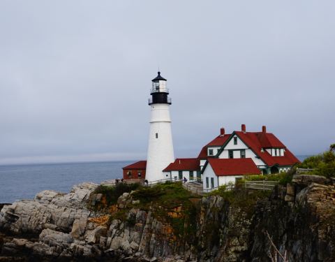灯塔是一个很粗壮的白色建筑,波特兰的沿海很长的海岸线,有数不尽的灯塔在关键的转弯处和山崖的边上的位置。