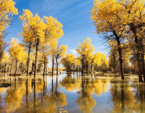 是欣赏胡杨林美景的绝佳地点,去年国庆去的,位于内蒙古阿拉善,来到这里就仿佛置身金色童话世界,大量的胡杨林,静静的湖泊,湖泊中的胡杨林倒影,组成了绝美的画面!