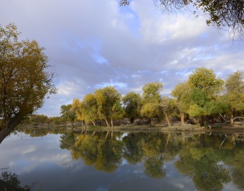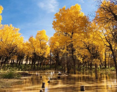 二道桥的胡杨林风景最好,因为二道桥的胡杨林都在水边,倒影在水中的胡杨别有一番景象,蓝天白云与金...