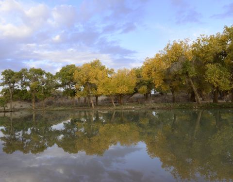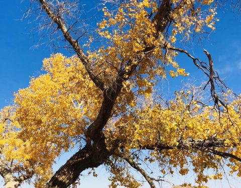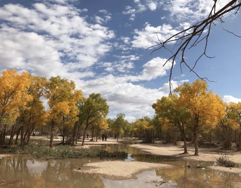 额济纳旗的胡杨林是从一道桥开始一直到八道桥,各个点位风景各有特色,纵观整个景区,二道桥的胡杨林风景最好,因为二道桥的胡杨林都在水边,倒影在水中的胡杨别有一番景象,蓝天白云与金色胡杨映在水中,分辨不出哪儿是天哪儿是地哪儿是水。