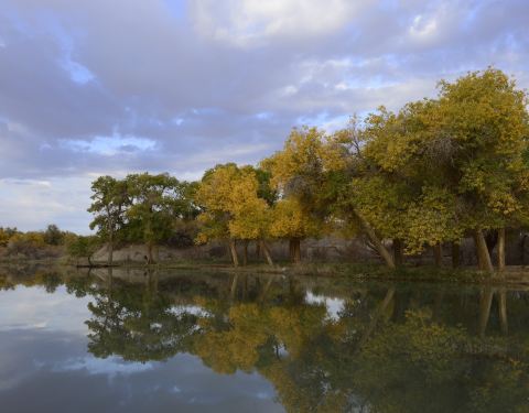 额济纳旗的胡杨林是从一道桥开始一直到八道桥,各个点位风景各有特色,纵观整个景区,二道桥的胡杨林风景最好,因为二道桥的胡杨林都在水边,倒影在水中的胡杨别有一番景象,蓝天白云与金色胡杨映在水中,分辨不...