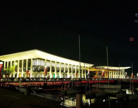 照射着整个浮山湾畔,每当夜幕降临灯光燃起后浮山湾畔五彩缤纷绚丽多彩,峰会会议中心在彩灯的照射下...