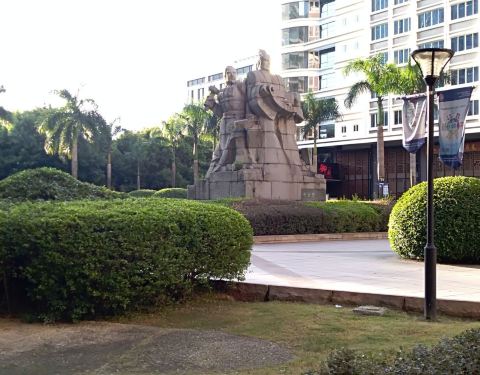 福州广场就在福州温泉公园西大门的正对面,是一个被周边高大楼房围起来的一个长方形绿地,中间有一组雕塑是为了纪念福州开设建城时的人物的。