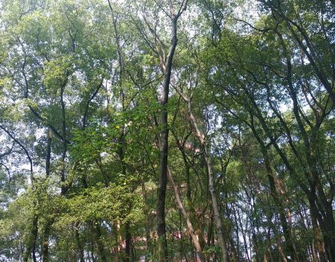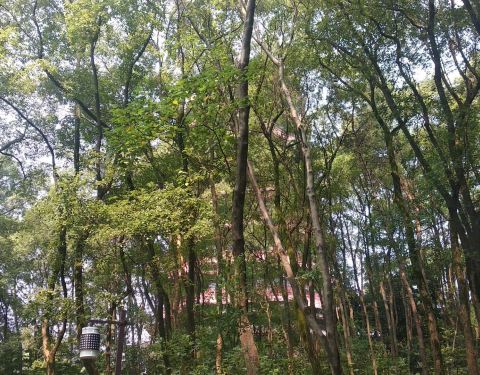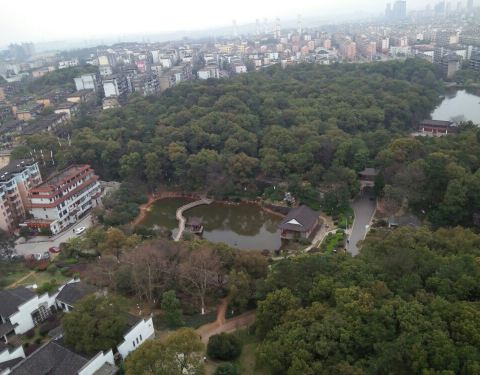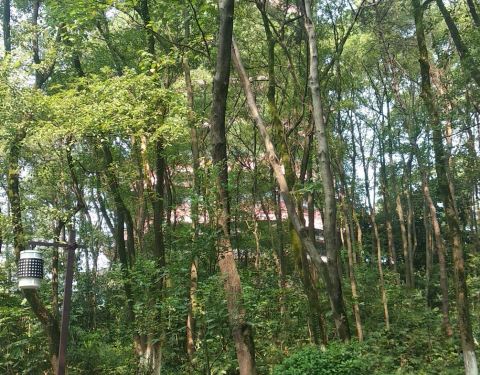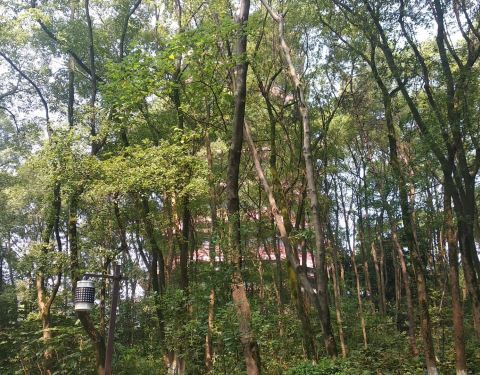在抱石公园后身,远望可见,走近反而由于参天古树反而半掩半漏