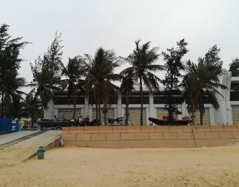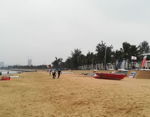 海口观海台附近的海滩有金黄色的沙子,海水也清澈湛蓝,这个季节海滨风大,游客很少,夏天一定是非常棒的,一定会游客满海滩了啊!