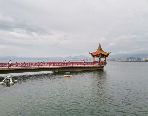 海心亭在栈道的尽头,直接深入美丽的洱海,周边视野开阔,景色优美,游客们可以在此极目楚天,放松心...海心亭在栈道的尽头,直接深入美丽的洱海,周边视野开阔,景色优美,游客们可以在此极目楚天,放松心境,同时也可以观赏在湖面上翱翔、戏水、悠哉悠哉的燕鸥。