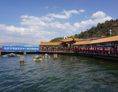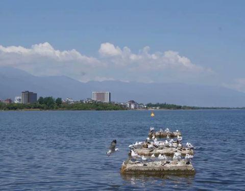 海心亭在栈道的尽头,直接深入美丽的洱海,周边视野开阔,景色优美,游客们可以在此极目楚天,放松心境,同时也可以观赏在湖面上翱翔、戏水、悠哉悠哉的燕鸥。