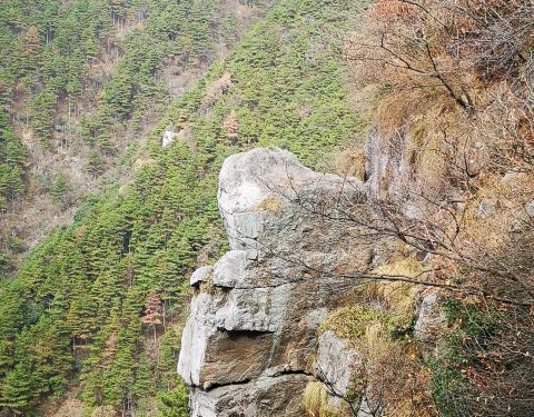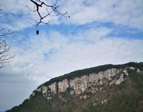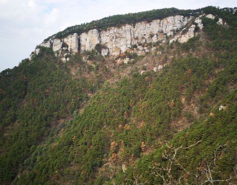 仿佛是一块从天而降的巨石,立于锦绣谷内的山崖边,一边是蜿蜒的山路、一边是长江畔的广袤平原,风光优美