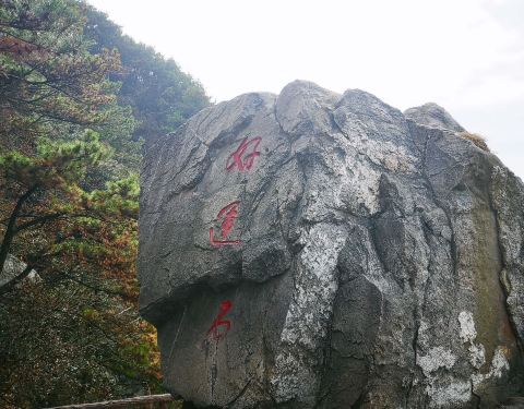 这是一个独立的大石头,上面刻着好运石,它坐落在庐山风景区内,这里的景色非常美丽迷人,山谷风光秀丽,突出的山岩令人观景视野非常宽阔。