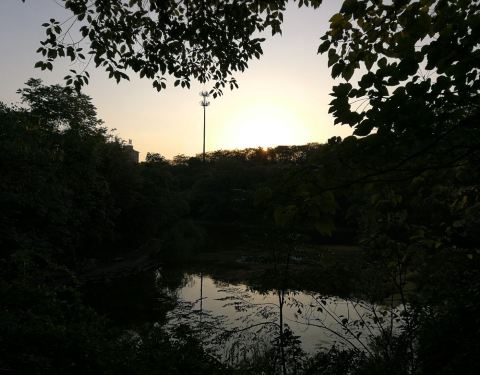 离我家比较近,树木葱茏,池塘如镜,曲径通幽,散步的人很多