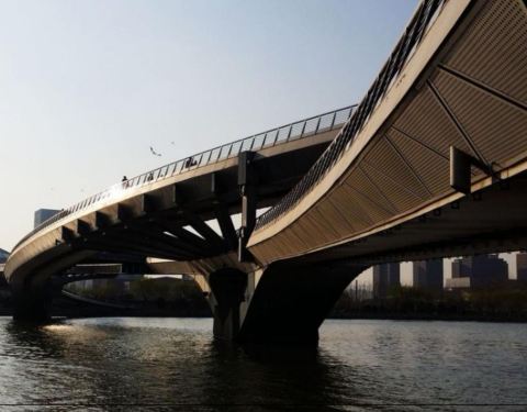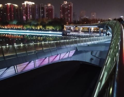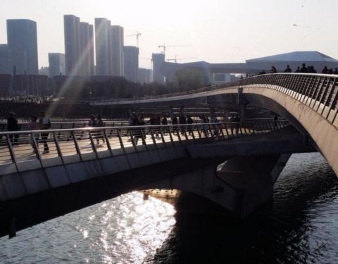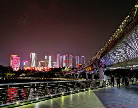 该桥为太原汾河上唯一一座步行桥,设计巧妙,造形别致,桥西是长风商务区,图书馆,科技馆,美术馆,大剧院等几大场馆都在那里,是人们休闲放松的好去处。