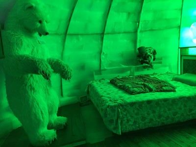 场馆其实不大的,不过这里能够体会到冰雕的乐趣。进门的话,就会有冷气袭来,里面的展示品很漂亮,有各类动物,还有个冰滑梯呢,拿块垫子体验一下冰滑梯,虽然冷,不过很好玩。还有小冰屋,里面还放了小床,好看是好看,就是真心冷。