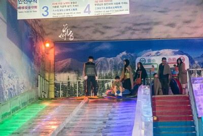 冰雕馆和3D艺术馆,是在一起的,冰雕馆在一层,3D艺术馆在三层,在国内也有这些,错觉艺术馆之类的。冰雕博物馆是济州第一个四季常设的室内冰雕展示馆,于2012年7月全新开幕。一年四季365天,不论季节、气温,全年保持零下5℃,任何时候都可以在济州看到各式主题的室内冰雕展示,冰雕博物馆展示了代表济州的泰迪熊冰雕、热带鱼等等,除此之外还有北极村的冰屋、冰滑梯等,各式的冰雕展示。 冰雕馆不提供棉衣,所以大家都是急急忙忙的拍照赶快出去,太冷了。不过还是有一些勇士,穿着单衣在玩冰滑梯。