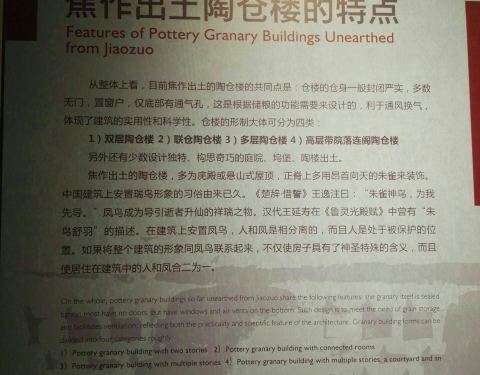焦作市博物馆是一个很值得去看看的地方。焦作,古称山阳,是汉代最后一个皇帝汉献帝被废之后的落脚之地。焦作市博物馆现拥有藏品万余件,上起远古,下至近现代,有青铜、陶瓷、玉器、钱币、书画、石器、木器、杂器等诸多种类。其中壮观的汉代陶仓楼、当阳峪绞胎瓷罐、“山阳”铭文陶罐等成为焦作地区的代表性文物。