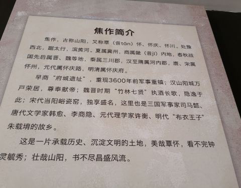 焦作市博物馆:焦作是中华文明的发祥地之一,古代称山阳,为历史名城,文化遗产丰富,有全国重点文物保护单位27处,历史名人众多。三楼展厅以山之阳为主题,陈列和展出焦作不同时期的文物精品和名人介绍。