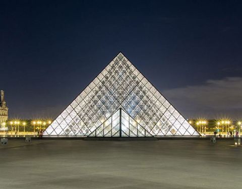 贝聿铭老先生设计的玻璃金字塔,巧妙利用三角形几何形态并勾勒出立体空间的美妙,是典型的贝式风格。现代建筑与古老宫殿完美结合,通透的玻璃材料为地下空间提供了良好的采光,因为玻璃金字塔是游客参观卢浮宫的入口,光线由明到暗,循序变化,一点点把人们的视线带进艺术的殿堂。他没有在广场上立一座丰碑,建一座雕塑,而是利用现代艺术,低调地把一颗钻石镶嵌在艺术瑰宝之中。夜晚的玻璃金字塔散发出夺目璀璨的光芒,卢浮宫环绕在它周围,愈发显得神秘。