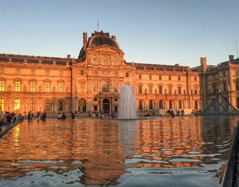 夜晚的玻璃金字塔散发出夺目璀璨的光芒,卢浮宫环绕在它周围,愈发显得神秘