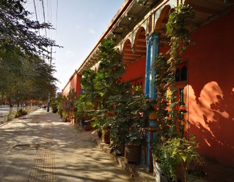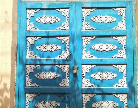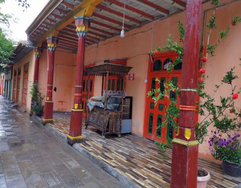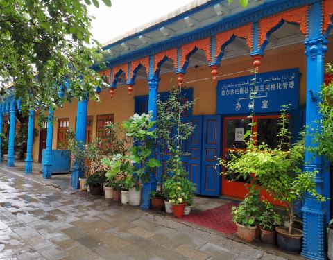 免费随便逛。坐公交到库车王府前经过的一条长长的路就是老城区主要街道了,路两旁的门面都是彩色又沧桑的感觉,比伊宁老城的残旧些但门窗装饰设计好像没怎么重复,每家门面都是独特的。能进入居民小区的小巷都设置了安检,所以我没有进到里面看。