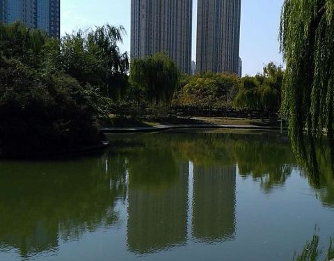 来到淄博,就住在附近的酒店,从楼上看到有个公园就过来散散步。这里有水,有树,有花,有草,绿意盎然,生机勃勃,进入秋天,有的树叶泛起了红色,银杏叶也渐渐变黄,公园中的莲池倒映着两边的高楼,行走在健身路径上,不时会看到雕像小景,虽然是人工设计的景观,却也让人感觉心旷神怡。