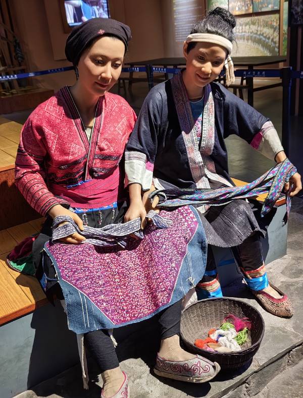 苗族妇女日常穿大襟衣,下穿百褶裙或宽脚裤,布料以蓝、白、黑色为主。百鸟衣为女子节日盛装。