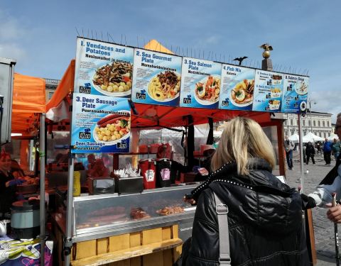 芬兰的物价格非常贵,所以这里的餐饮相对之下就显得比较便宜。赫尔辛基露天市集广场是在码头旁边