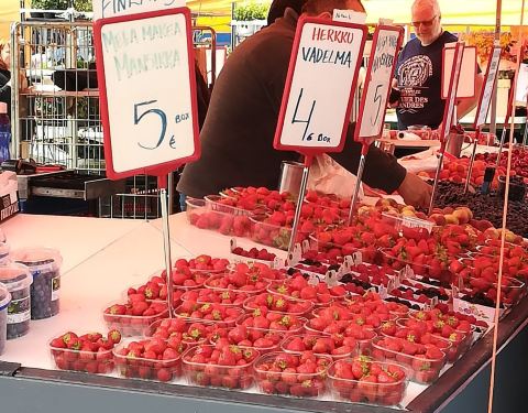露天自由市场里一个个小摊位贩卖着花草、家常食物、一般用品、手工艺品等,充满芬兰的生活风情。阳光明亮的夏天时分,可看到色彩缤纷的小棚子底下陈列着各式各样的新鲜鱼类、蔬果及鲜花。