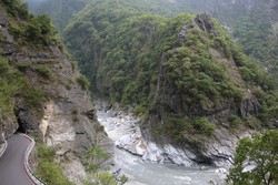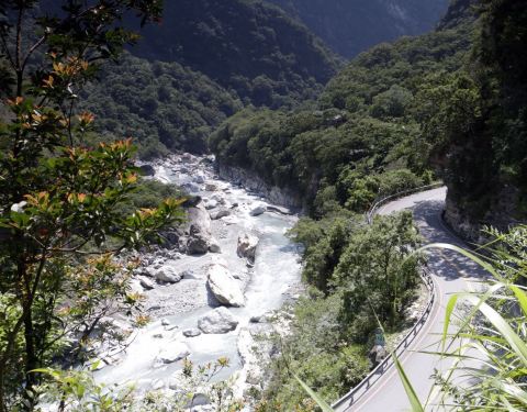 这是当年日本人用古法修筑的步行小道,步道的分叉路一直可以到山脉的深处,我们走了向合流方向的步道,穿过一段30米长的漆黑隧道,出口直接是一段几十米高的挂壁步行道,下方的河流,公路,河中间的大理石横七竖八,断桥枯木,直接呈现在我们眼前,风光无限啊!步行道不长,个把小时的路程就到了出口,出口的大路是现代修的,明显没有古法修筑的坚固。