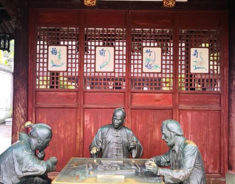 在天一阁博物馆内设置了一个庭院作陈列,到处都是满满的麻将元素。平和堂下的雕塑“三缺一”,竟然还有洋人的形象,而许多游客特别喜欢坐在“缺一”的位置上拍照沾沾运气。德和堂里面更加精彩,各种年代、地区的麻将陈列在玻璃罩内,也有很多与麻将相关的器具展示,并介绍了麻将的起源和发展,看了很有收获。