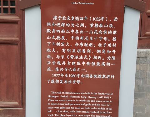 摩尼殿是隆兴寺内最重要的,最有特色的建筑物,其结构平面图呈十字形,里面的壁画与东方维纳斯都很震撼人心,我在哪里听导游反复讲了三遍。