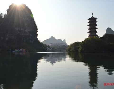桂林的塔很多,其中最有名的是日月双塔,也叫金银双塔,其次就是木龙塔了。木龙塔无论白天或晚上拍照都美翻了,日月双塔则是夜晚拍更好,因为白天照会照上背景中的景区外民房,而木龙塔从任何方向照都不会照到景区外的民房。