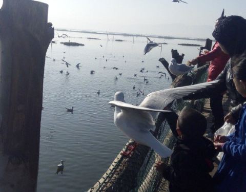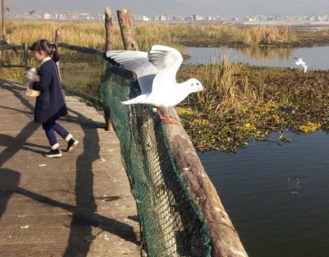 喂海鸥的栈道修在湖中间,和海鸥零距离接触。纳古镇杞麓湖是我见过海鸥最多而游客最少的云南海子