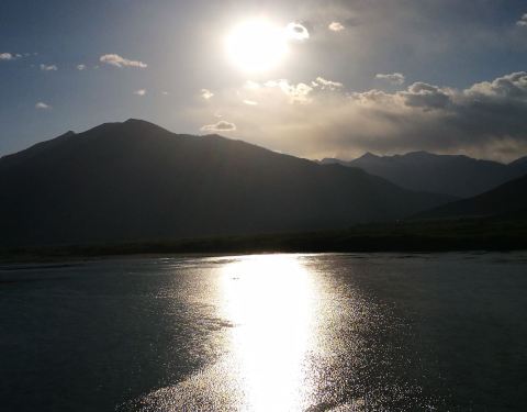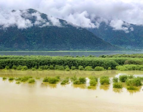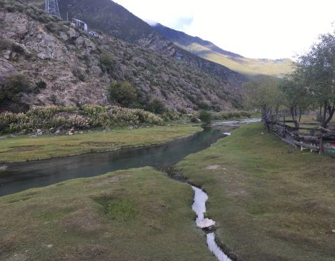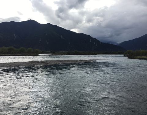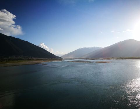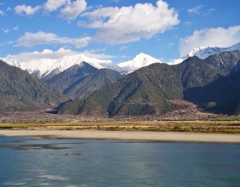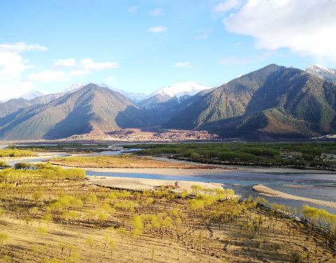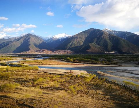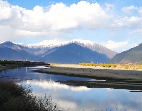 形成了比较宽阔的地带,江水也较为平缓, 水漫两岸,形成众多的浅滩湿地,湿地流域地形复杂,两侧雪山高耸