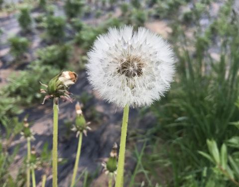 ...的时候很美 草地上有许许多多的黄色的蒲公英花和白色的蒲公英 天空非常的蓝 特别是傍晚的天空很美