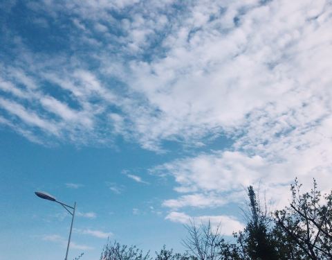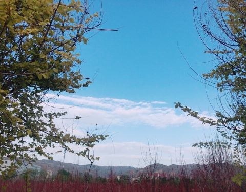 青海大学挺漂亮的 道路两旁有许许多多的树 春天樱花开的时候很美 草地上有许许多多的黄色的蒲公英花和白色的蒲公英 天空非常的蓝 特别是傍晚的天空很美